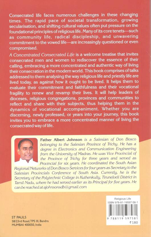 A Concentrated Consecrated Life is a welcome treatise that invites consecrated men and women to rediscover the essence of their calling, embracing a more concentrated and authentic way of living their consecration in the modern world. This book comprises of talks addressed to them analysing the way religious life and priestly life are lived today, as against how it ought to be lived. It helps them to evaluate their commitment and faithfulness and their vocational fragility to renew and revamp their lives. It will help leaders of dioceses, religious congregations, provinces and communities to reflect and share with their subjects, thus helping them in the dynamics of vocational accompaniment. Whether you are discerning, newly professed, or years into your journey, this book invites you to embrace a more concentrated manner of living the consecrated way of life.