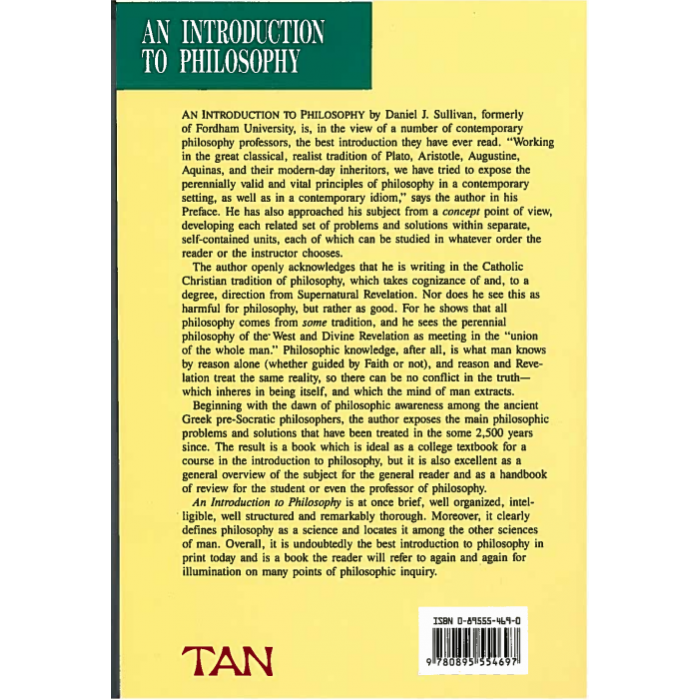 An Introduction to Philosophy by Daniel J. Sullivan is intended for the general reader as well as for the student. Its primary purpose is to present the elements of philosophy with simplicity and clarity in order to arouse that sense of wonder which Aristotle says is the beginning of the love of wisdom. This well-structured overview begins with an historical study of philosophy, tracing the evolution of philosophical problems from their simplest origins, and continues with an analysis of the more concrete problems about man himself. The more abstract problems of man and his relation to the world around him make up the final study of this book. Sullivan works in the great classical, realist tradition of Plato, Aristotle, Augustine, Aquinas, and their modern-day inheritors, exposing the perennially valid and vital principles of philosophy and emphasizing the profound moral and social implications of these principles. He respects the distinction between natural and revealed wisdom, but does not hesitate to point out how the conclusions of philosophy are complemented by the truths of revelation. An Introduction to Philosophy clearly demonstrates that philosophy is a good deal more than a classroom exercise!