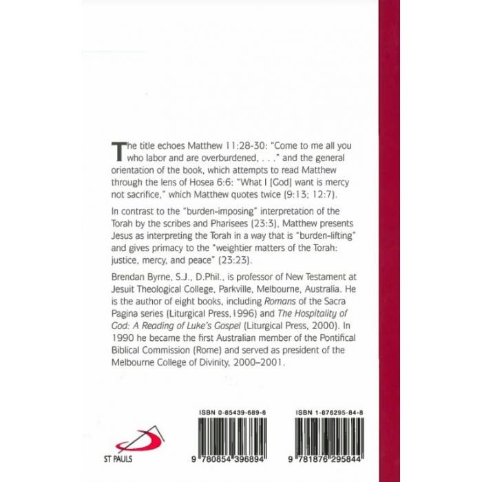 The title echoes Matthew 11 :28-30: "Come to me all you who labour and are overburdened.. . ." and the general orientation of the book, which attempts to read Matthew through the lens of Hosea 6:6: "What I [God) want is mercy not sacrifice." which Matthew quotes twice (9:13: 12:7). In contrast to the 'burden-imposing" interpretation of the Torah by the scribes and Pharisees (23:3), Matthew presents Jesus as interpreting the Torah in a way that is 'burden-lifting" and gives primacy to the "weightier matters of the Torah: justice, mercy, and peace" (23:23).