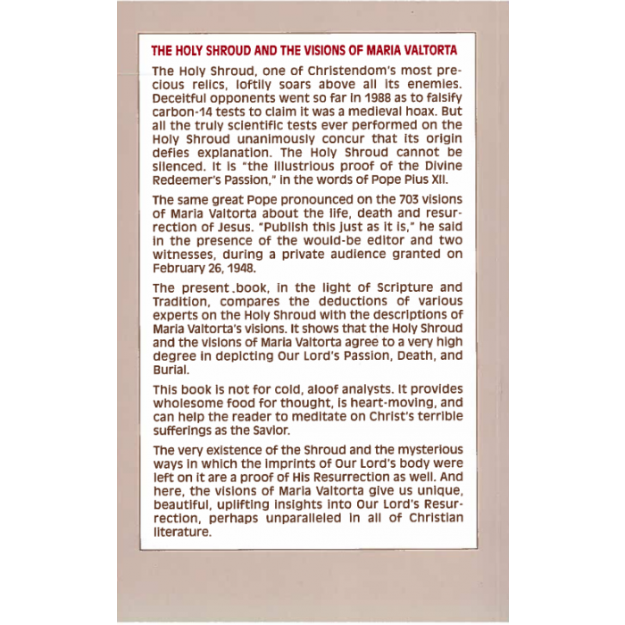 In light of scripture and tradtion, this book compares the deductions of various experts on the Holy Shroud with the descriptions of Maria Valtorta's visions