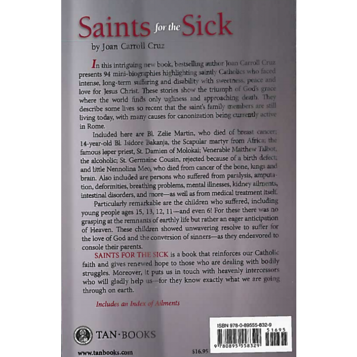 In this intriguing new book, bestselling author Joan Carroll Cruz presents 94 mini-biographies highlighting saintly Catholics who faced intense, long-term suffering and disability with sweetness, peace and love for Jesus Christ. These stories show the triumph of God's grace where the world finds only ugliness and approaching death. They describe some lives so recent that the saint's family members are still living today, with many causes for canonization being currently active in Rome. Included here are Bl. Zelie Martin, who died of breast cancer; 14-year-old Bl. Isidore Bakanja, the Scapular martyr from Africa; the famous leper priest, St. Damien of Molokai; Venerable Matthew Talbot, the alcoholic; St. Germaine Cousin, rejected because of a birth defect; and little Nennolina Meo, who died from cancer of the bone, lungs and brain. Also included are persons who suffered from paralysis, amputation, deformities, breathing problems, mental illnesses, kidney ailments, intestinal disorders, and more-as well as from medical treatment itself. Particularly remarkable are the children who suffered, including young people ages 15, 13, 12, 11-and even 6! For these there was no grasping at the remnants of earthly life but rather an eager anticipation of Heaven. These children showed unwavering resolve to suffer for the love of God and the conversion of sinners-as they endeavored to console their parents. SAINTS FOR THE SICK is a book that reinforces our Catholic faith and gives renewed hope to those who are dealing with bodily struggles. Moreover, it puts us in touch with heavenly intercessors who will gladly help us-for they know exactly what we are going through on earth.